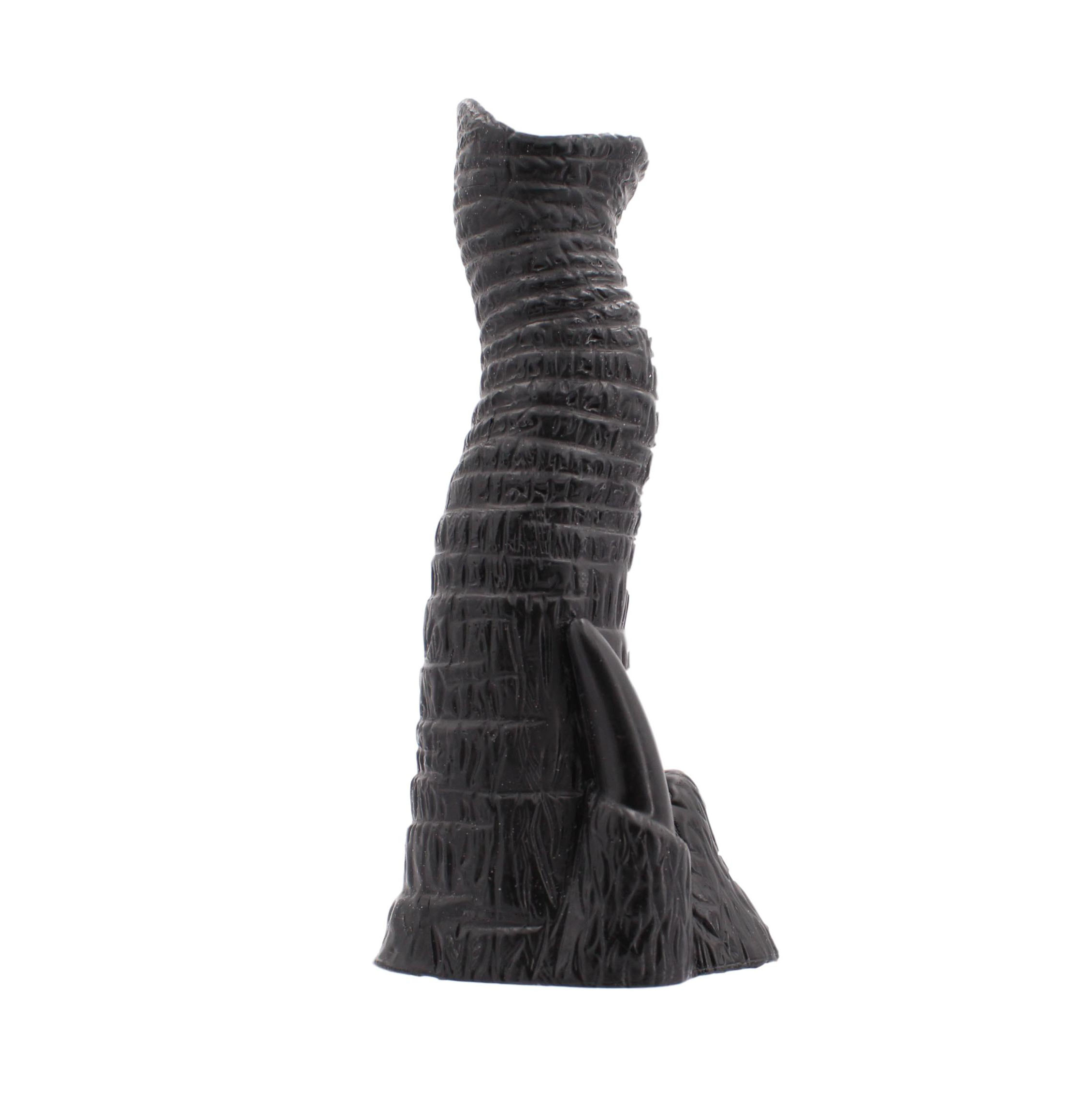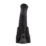 The shape represents an elephant trunk with its tusks. The upper part is flat and the surface of the dildo is ribbed. It has a suction cup base.