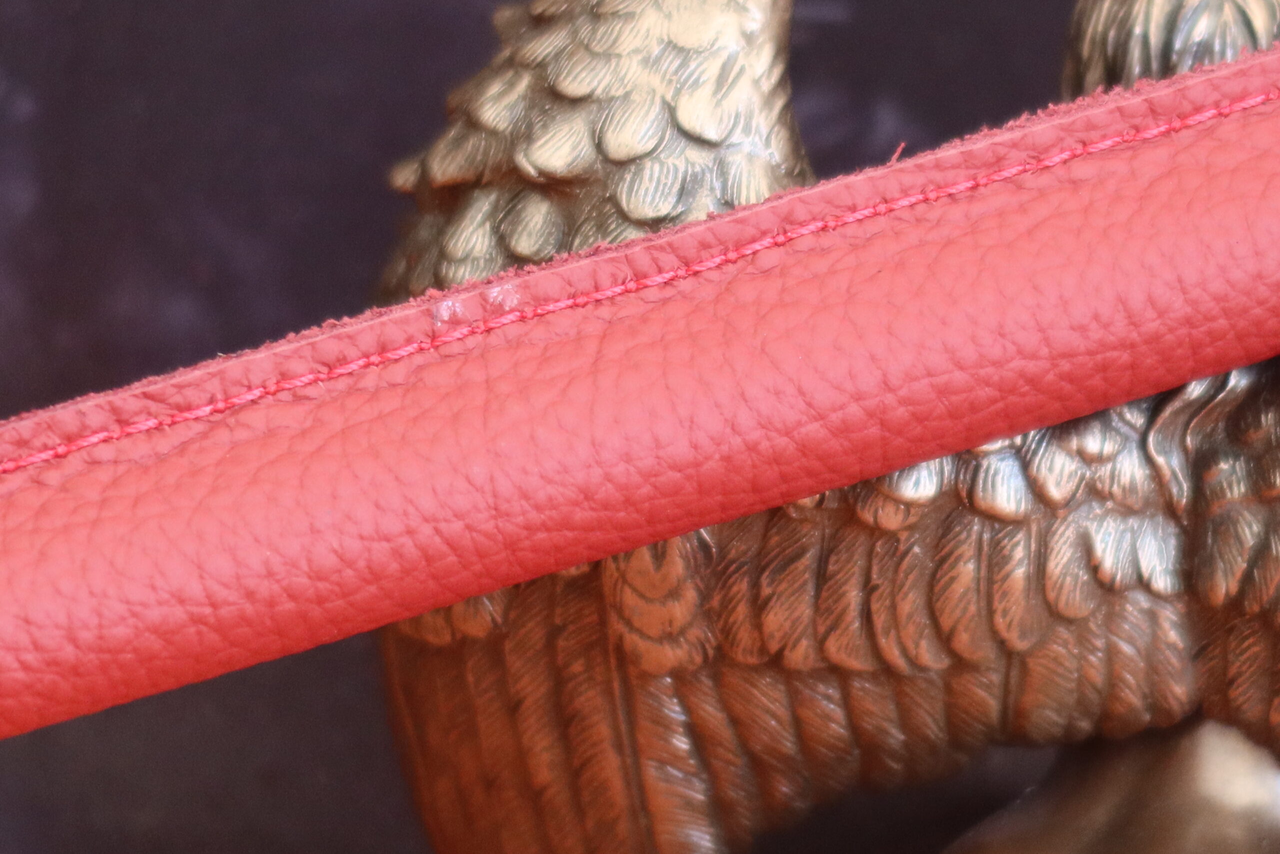 It is meticulously hand-wrapped in rich burgundy leather, elevated by striking red stitching that lends a bold yet sophisticated contrast. A polished black stainless steel D-ring adds both visual distinction and practical versatility.