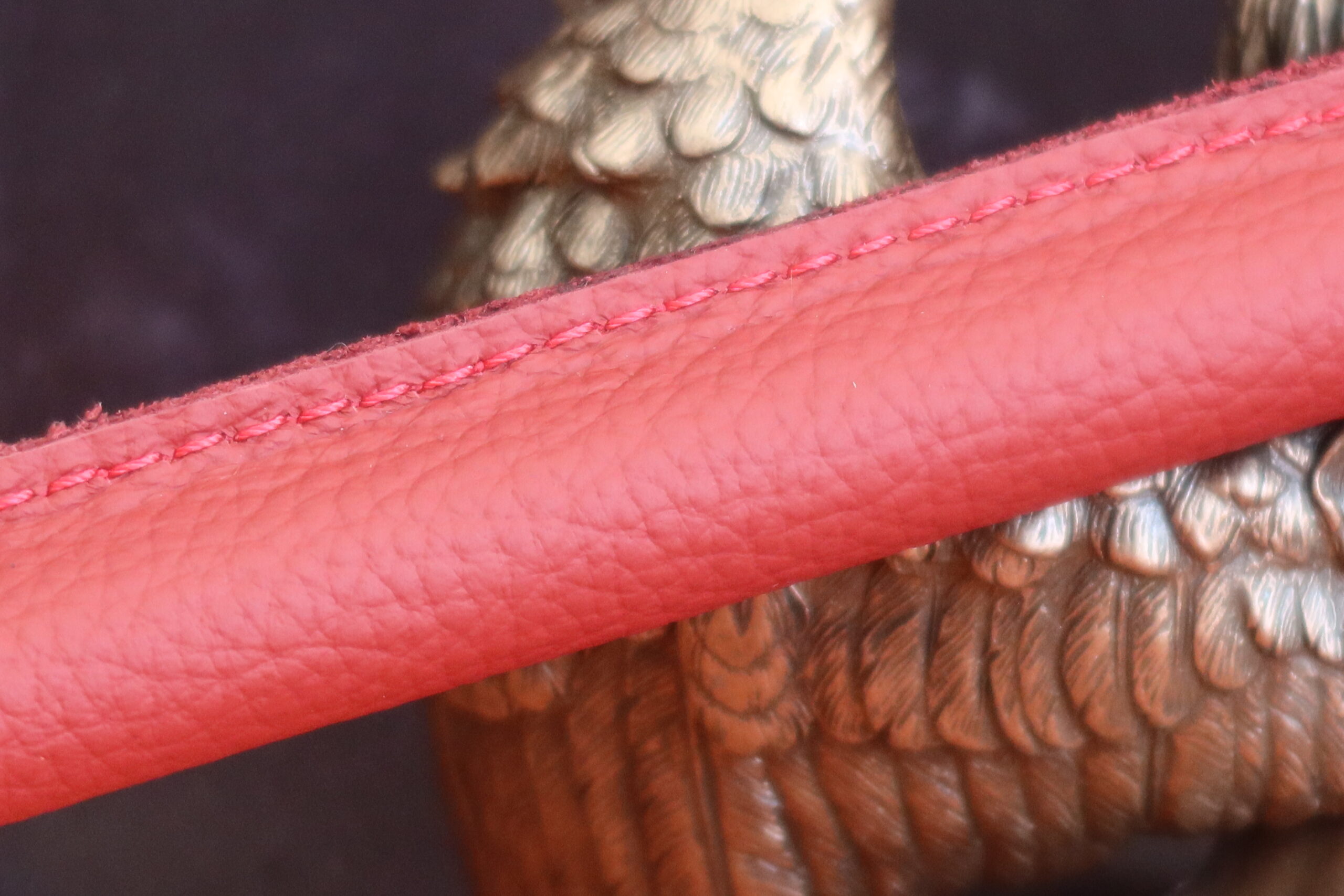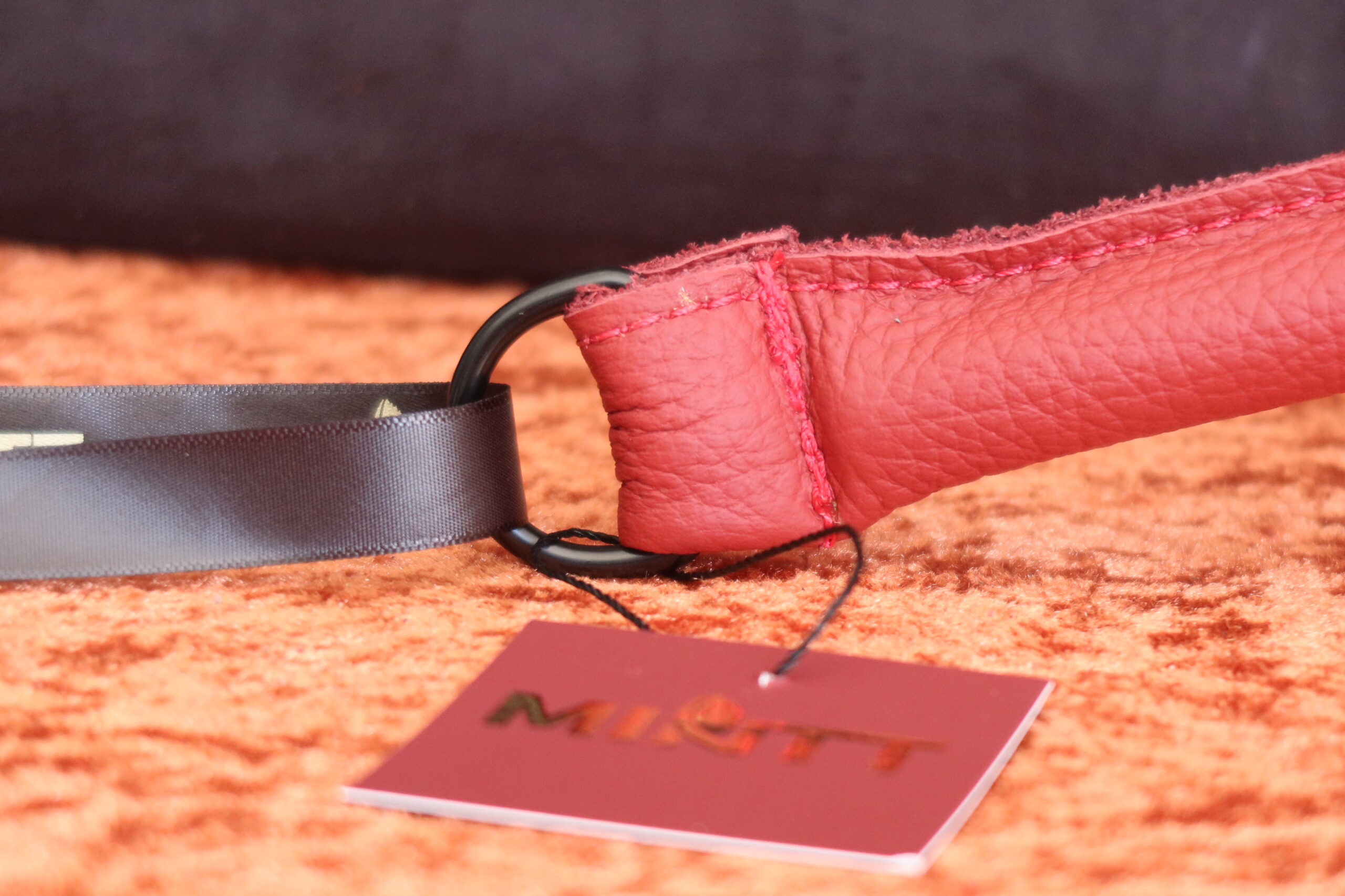 It is meticulously hand-wrapped in rich burgundy leather, elevated by striking red stitching that lends a bold yet sophisticated contrast. A polished black stainless steel D-ring adds both visual distinction and practical versatility.