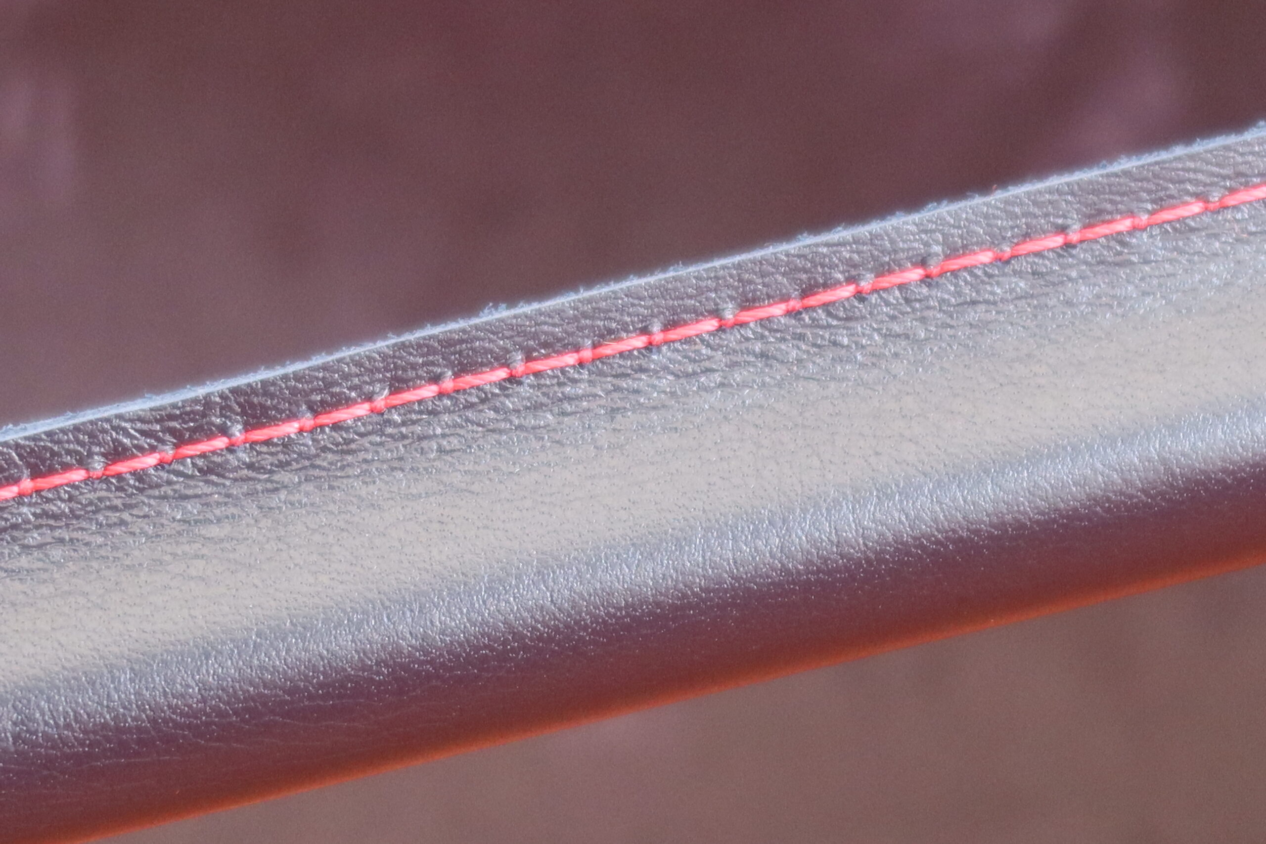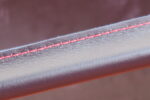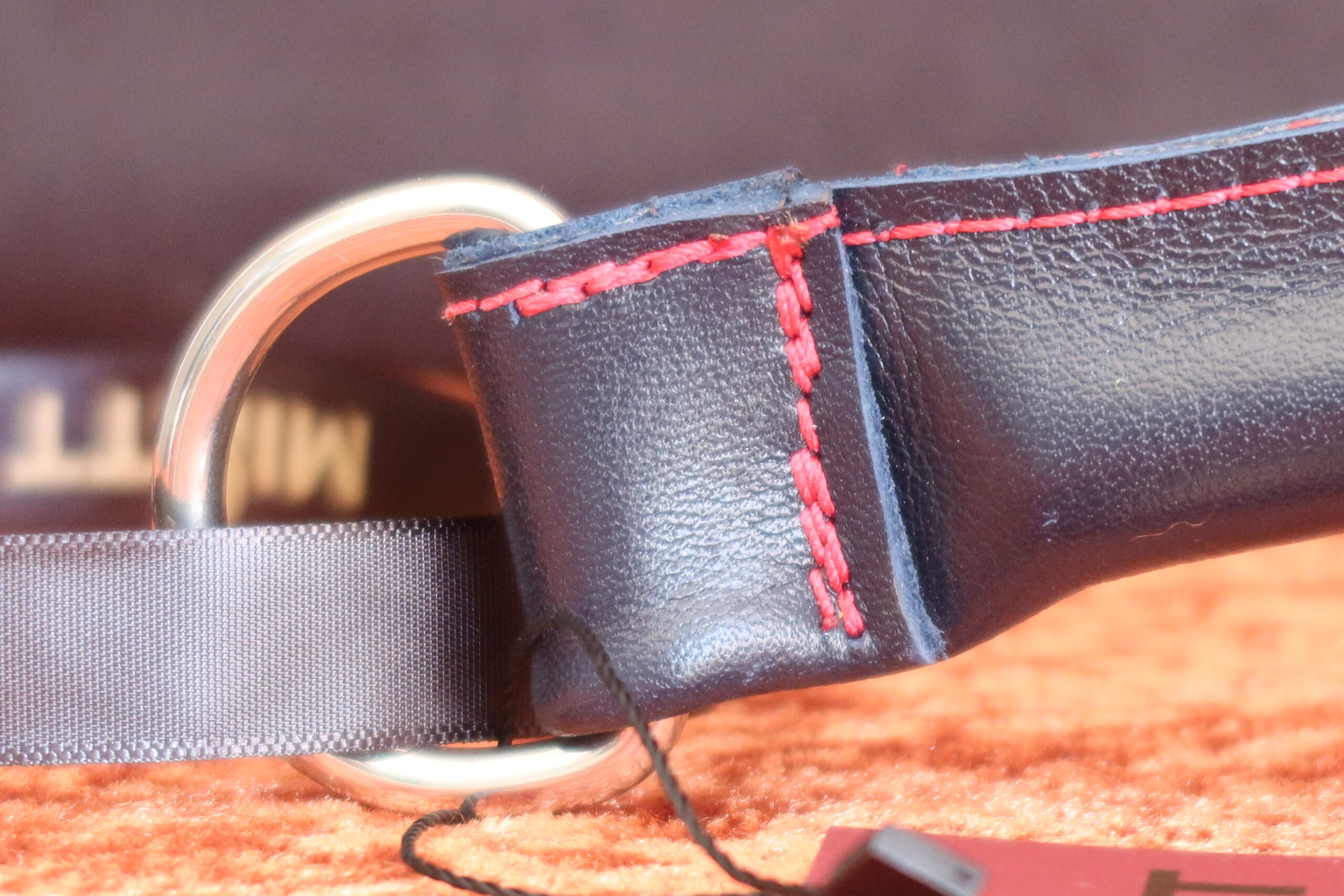 It is meticulously hand-wrapped in rich navy leather, elevated by striking red stitching that lends a bold yet sophisticated contrast. A polished stainless steel D-ring adds both visual distinction and practical versatility.