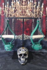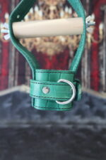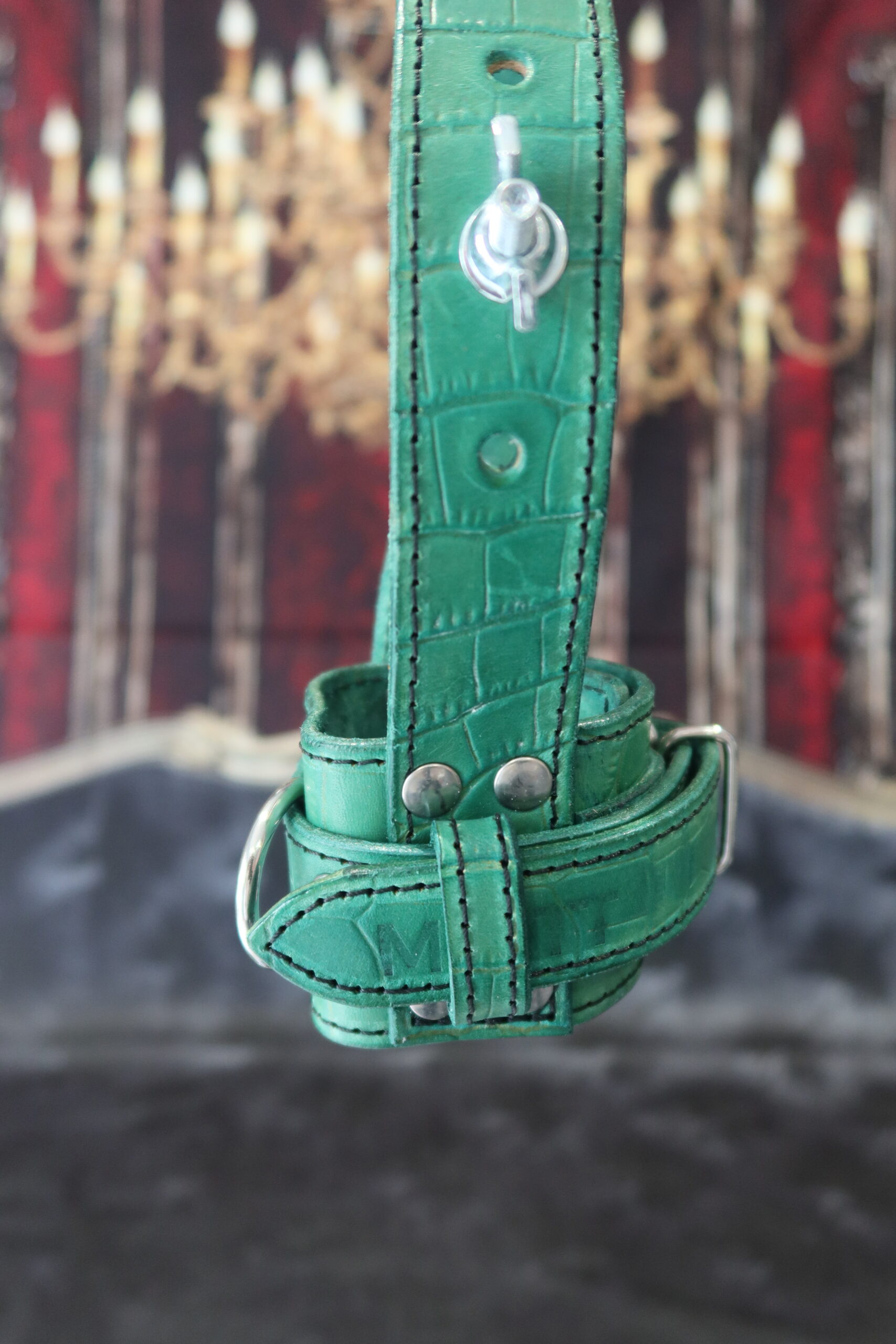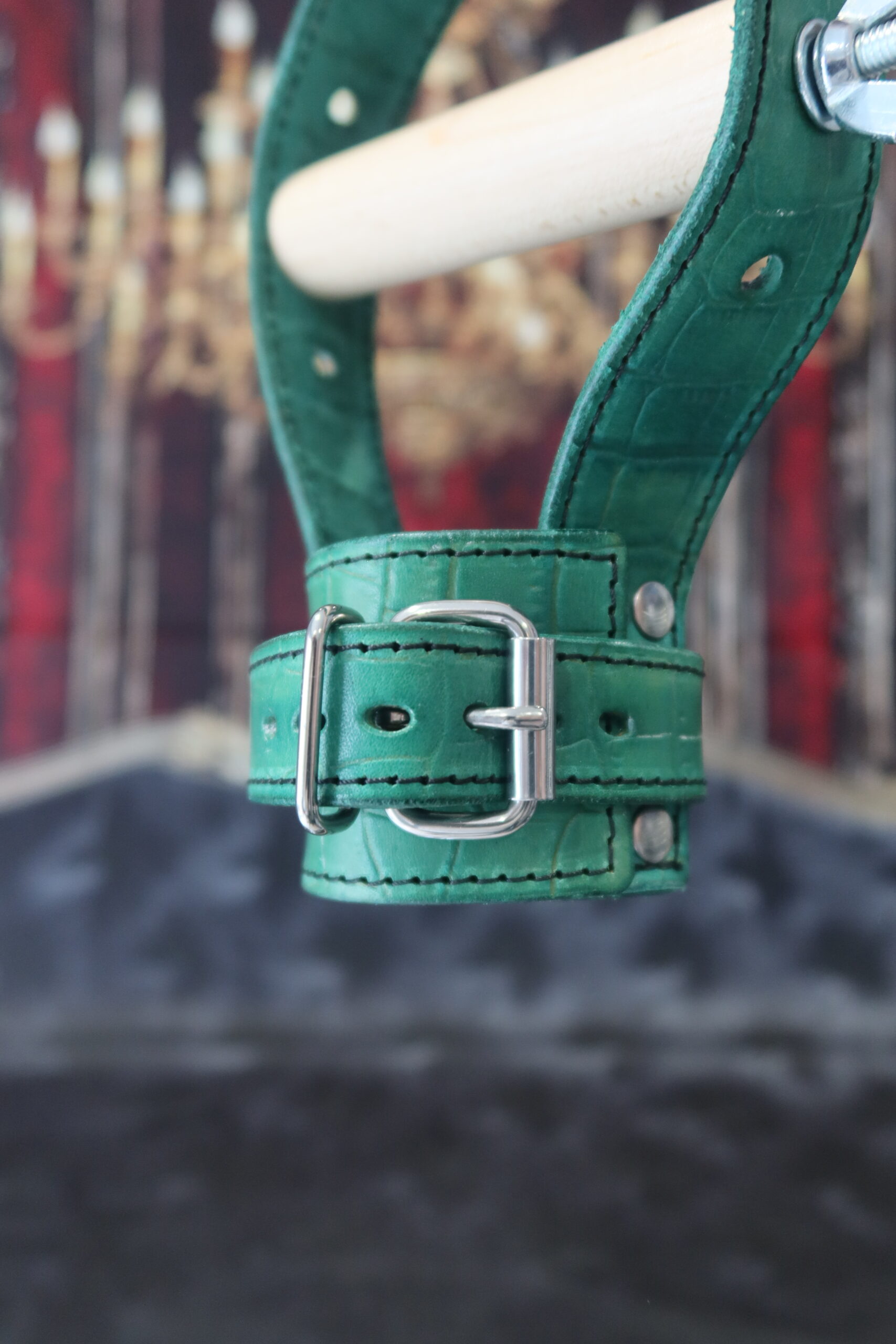 Dyed Set of Green Croc Print Suspension cuffs with Black  Stitching, wooden Handle and Stainless steel Nickel Free fittings