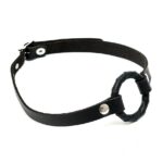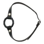 Genuine leather mouth gag with ring. The metal ring is covered with Nappa leather and has an inner diameter of 37 mm and an outer diameter of 52 mm. This gag is adjustable over 7 positions and closes at the back with a metal buckle.