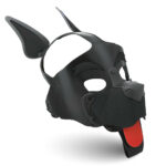 Step into your primal side with this pup hood! Designed for maximum visibility, it boasts large eye holes that allow you to keep a sharp lookout. A strap down the scalp holds the big, perky ears securely in place, showing off your hair for added flair. The protruding muzzle features a playful, red, panting tongue hanging out, enhancing your canine look. The muzzle and tongue are easily removable whenever you need to use your mouth, thanks to the handy snaps. Perfectly crafted to fit most heads, this pup hood offers a one-size-fits-all solution. Made from high-quality vegan leather, it looks authentic and is easy to maintain.