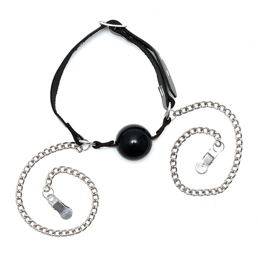 Leather strap ball gag with adjustable buckle for sizing. Attached to silver chained nipple clamps which can be removed.