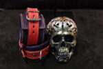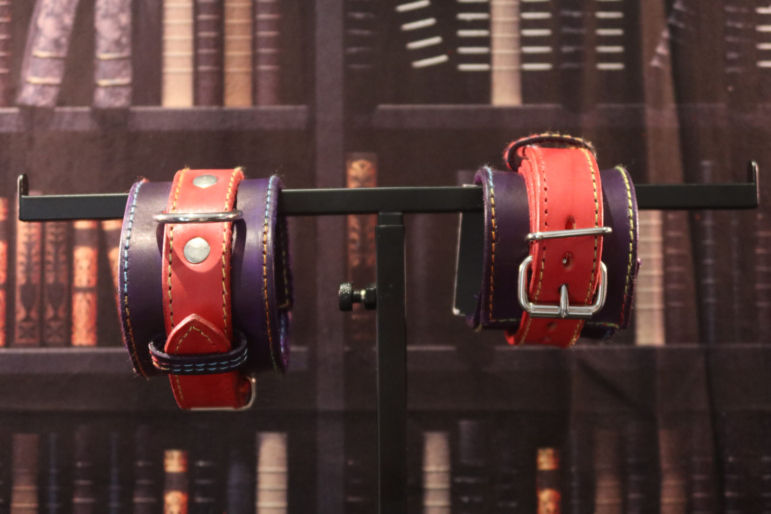 Dyed Purple and Red cuffs with Rainbow Stitching and Stainless steel Nickel Free fittings