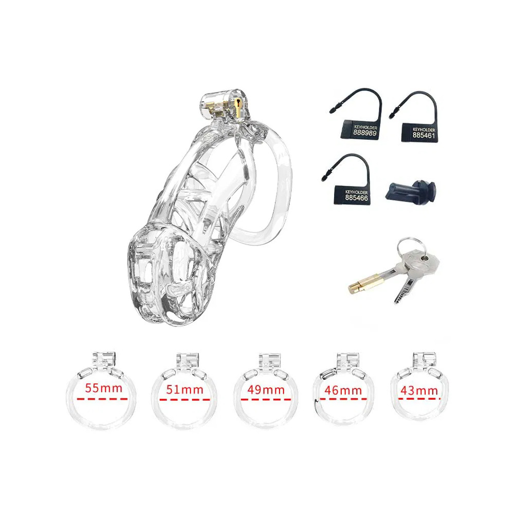 This penis cage set includes 5 rings in different sizes, ranging between 43 – 55 mm. In addition, it includes 1 copper built-in lock and 3 plastic numbered padlocks. The plastic locks can be cut off with scissors after a single use. Lastly, one plastic screw is included as an alternative to the copper built-in locks, which may not pass security checks at airports, whereas the plastic lock is airport-friendly.