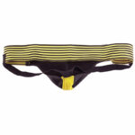 Sporty leather jocks with a coloured leather stripe and matching coloured striped band.