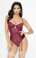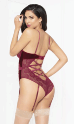 Velvet Wine Red strappy back teddy in floral lace, featuring sumptuous velvet side panels, satin elastic waistband Size XL